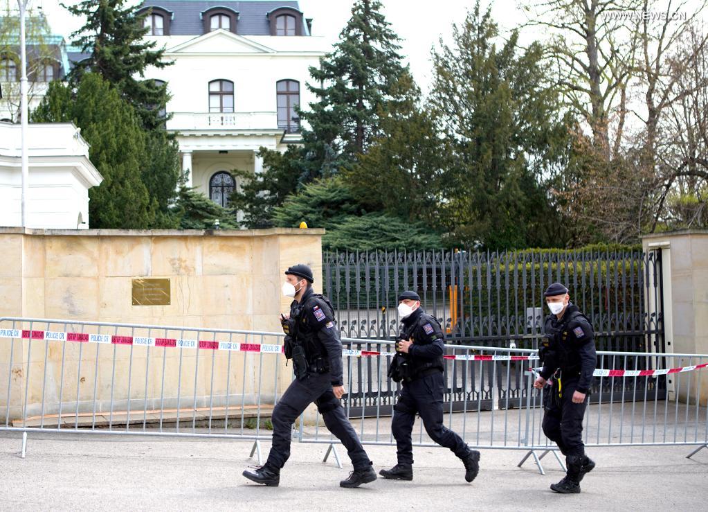 Czech police are seen outside the Russian embassy in Prague, the Czech Republic, on April 22, 2021. The Czech Republic will reduce and put a cap on the number of employees in the Russian embassy in Prague to the same number at the Czech embassy in Moscow, the Czech Foreign Ministry said on Thursday. (Photo by Dana Kesnerova/Xinhua)