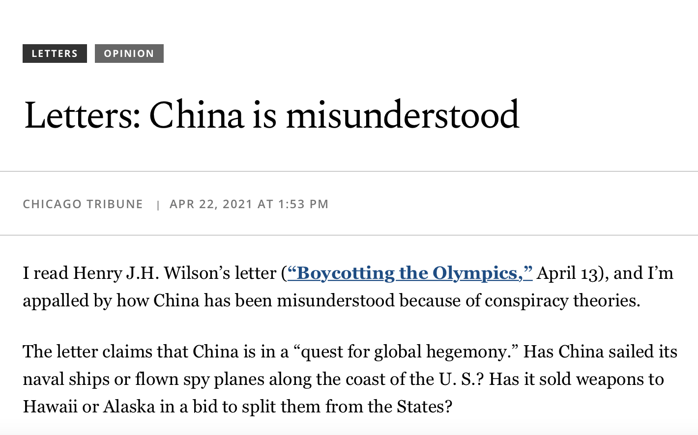Washington (People’s Daily) – China firmly opposes any slander aiming to misguide people to go against China and boycott the Beijing 2022 Winter Olympics, the spokesman of the Chinese Consulate General in Chicago wrote in the letters section of the Chicago Tribune on Thursday, refuting the claims of an improper letter published earlier by the newspaper.