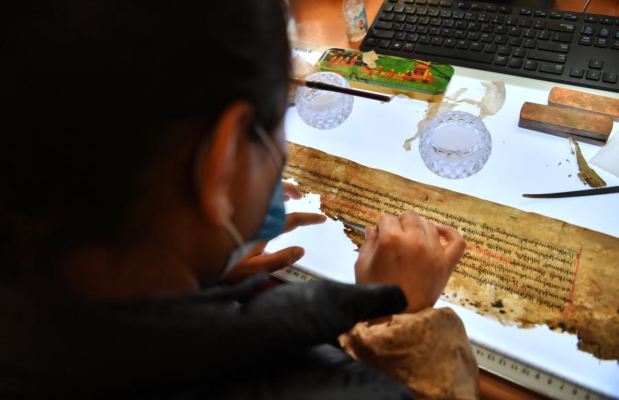 A staff member with the regional ancient book protection center restores a rare ancient book in Lhasa, southwest China's Tibet Autonomous Region, April 21, 2021. (Xinhua/Jigme Dorje)