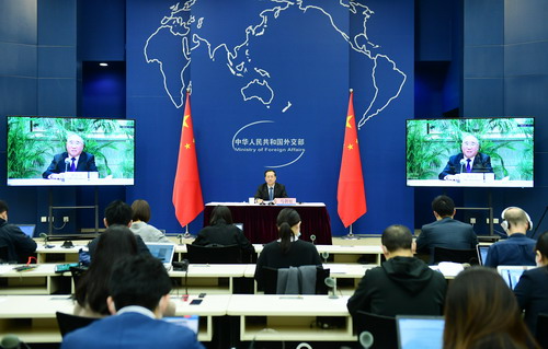Vice-Foreign Minister Ma Zhaoxu hosts a news briefing after President Xi Jinping joined world leaders at a virtual climate summit in Beijing on April 22, 2021. [Photo/fmprc.gov.cn]