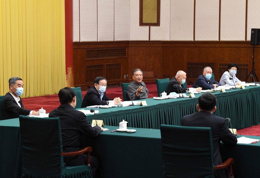 Wang Yang, a member of the Standing Committee of the Political Bureau of the Communist Party of China Central Committee and chairman of the Chinese People's Political Consultative Conference (CPPCC) National Committee, presides over a bi-weekly seminar held by the CPPCC National Committee in Beijing, capital of China, April 23, 2021. (Xinhua/Rao Aimin)