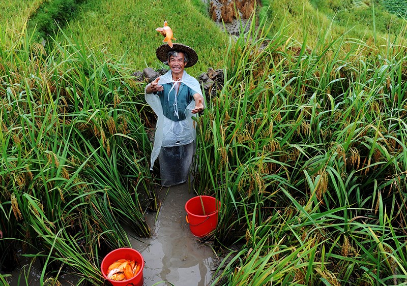 A farmer celebrates a fish harvest in Qingtian County, east China’s Zhejiang Province. (Photo from the official website of China Agricultural Museum)