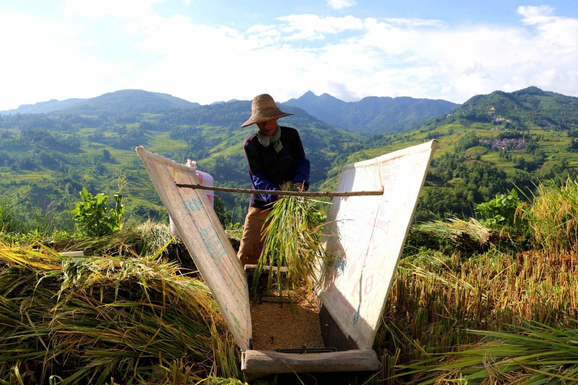 A farmer reaps rice in a terrace Yuanyang, Honghe Hani and Yi Autonomous Prefecture, southwest China’s Yunnan Province, Aug. 20, 2020. (Photo by Long Jun/People’s Daily Online)