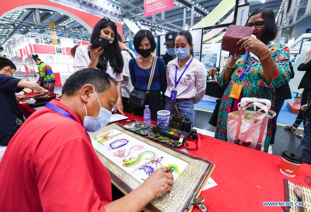 Participants view an artist designing a painting of letters during the 19th Conference on International Exchange of Professionals (CIEP) in Shenzhen, south China's Guangdong Province, April 24, 2021. The conference kicked off in China's tech hub Shenzhen on Saturday, attracting over 1,200 professional institutions and organizations as well as over 10,000 government representatives, experts and high-end talents from more than 30 countries and regions. (Xinhua/Mao Siqian)
