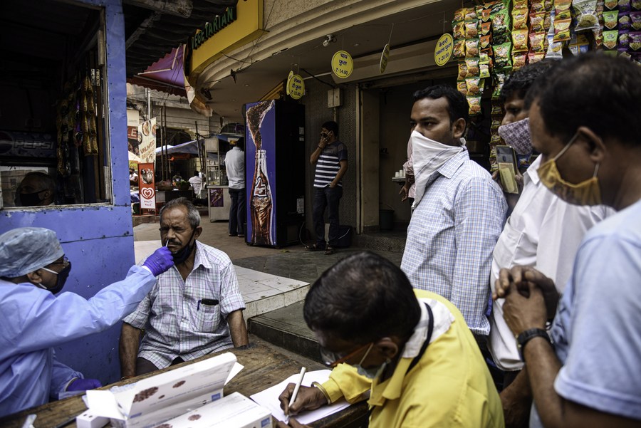 A health worker takes a swab sample from a vendor to test for COVID-19 at a vegetable market in Mumbai, India, March 18, 2021. (Photo by Fariha Farooqui/Xinhua)