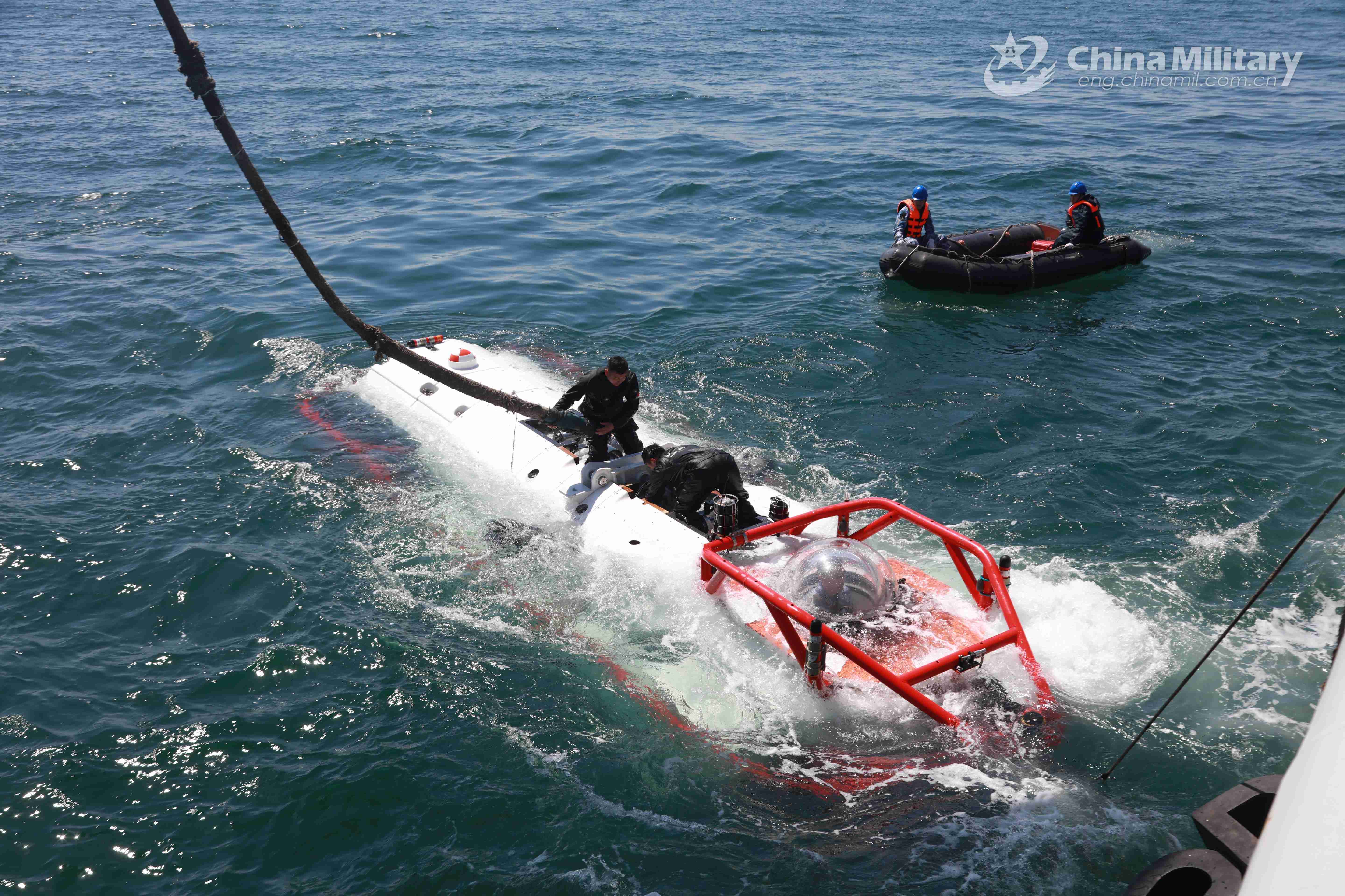 Sailors assigned to a search and rescue flotilla with the navy under the PLA Northern Theater Command drop deep submergence rescue vehicle during a maritime training exercise in early April, 2021. The training was aimed at examining the troops' rescue ability in actual combat context. (eng.chinamil.com.cn/Photo by Zhang Zehang)
