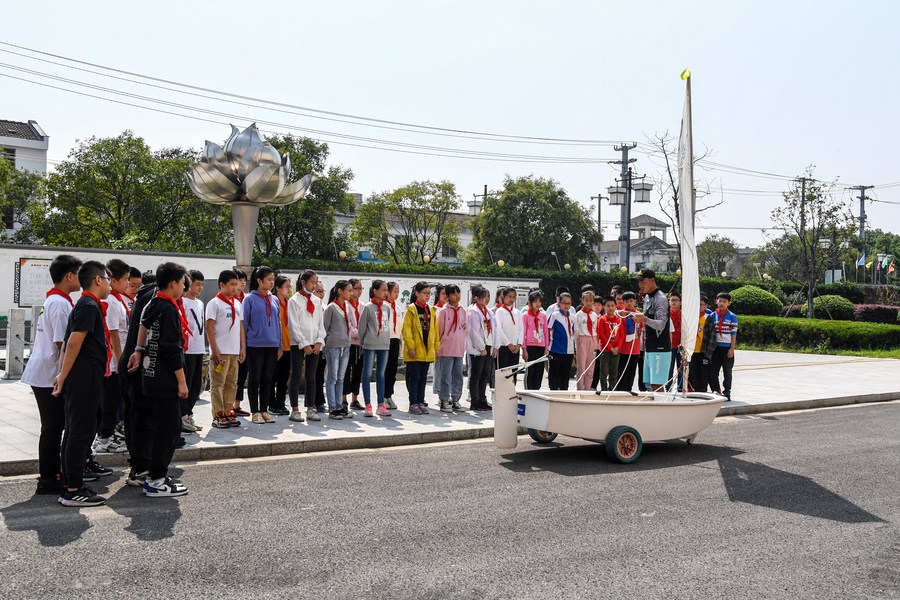 Students attend a sailing class in Suzhou of east China's Jiangsu Province, Sept. 24, 2020. The Suzhou Linhu No.1 Central Primary School, which is located by the Taihu Lake, included sailing in physical education from 2017. (Xinhua/Li Bo)