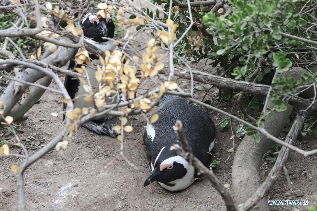 African penguins stay on the beach at Boulders Penguin Colony, Simon's Town, southwest South Africa, April 25, 2021. The African penguin is endemic to coastal areas of southern Africa. It has experienced rapid population declines over the past century as a result of over exploitation for food, habitat modification of nesting sites, oil spillages, and competition for food resources with commercial fishing. April 25 marks World Penguin Day, which is a celebratory and educative initiative that encourages people to learn more about penguins and their environment. (Xinhua/Lyu Tianran)