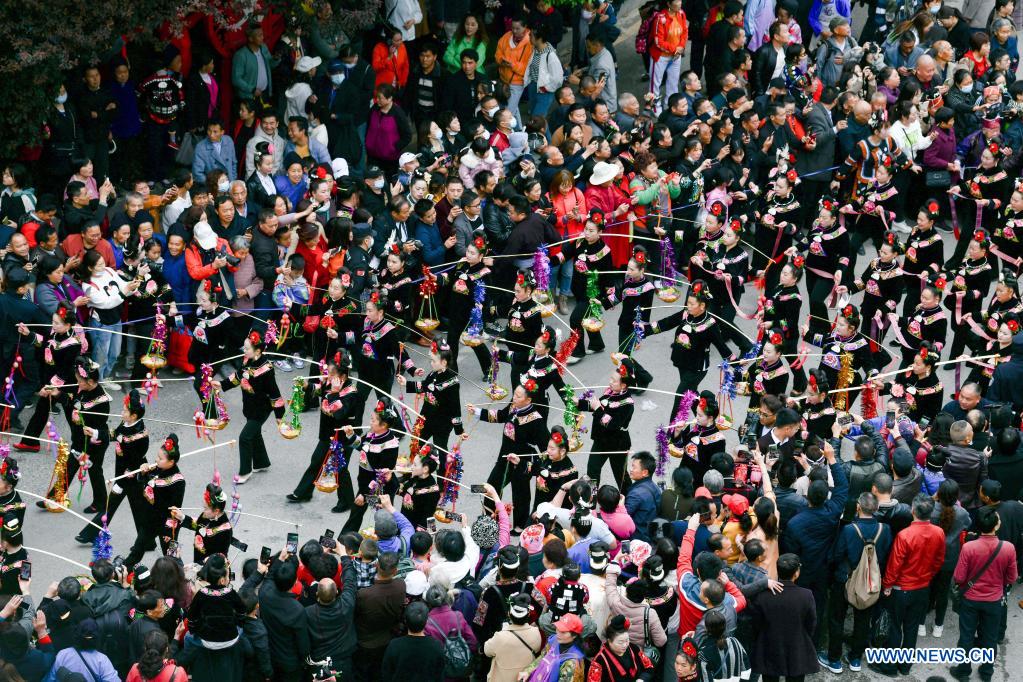People of Miao ethnic group attend a parade to celebrate the Miao Sisters Festival in Taijiang County, Qiandongnan Miao and Dong Autonomous Prefecture, southwest China's Guizhou Province, April 25, 2021. Recognized as a national intangible cultural heritage, the Miao Sisters Festival is celebrated annually around the 15th day of the third lunar month according to the lunar calendar in China. (Xinhua/Yang Wenbin)