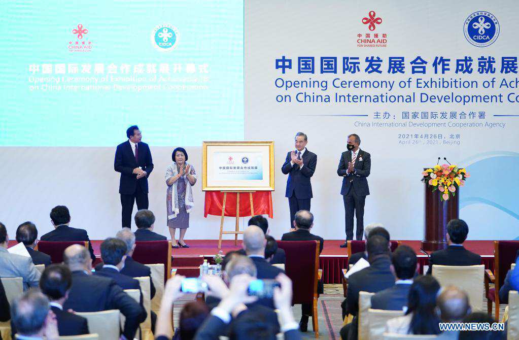 Chinese State Councilor and Foreign Minister Wang Yi attends the opening ceremony of Exhibition of Achievements on China International Development Cooperation and delivers a speech in Beijing, capital of China, April 26, 2021. (Xinhua/Li Xiang)