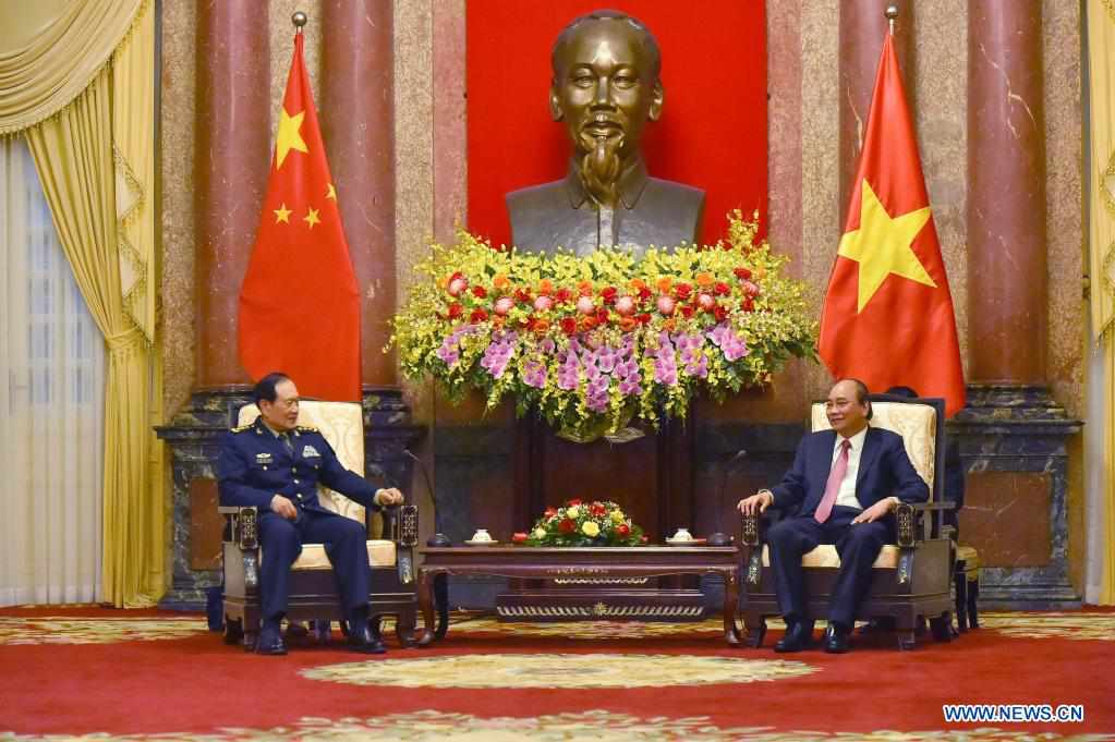 Vietnamese President Nguyen Xuan Phuc (R) meets with visiting Chinese State Councilor and Minister of National Defense Wei Fenghe in Hanoi, Vietnam, on April 26, 2021. (Xinhua/Jiang Shengxiong)