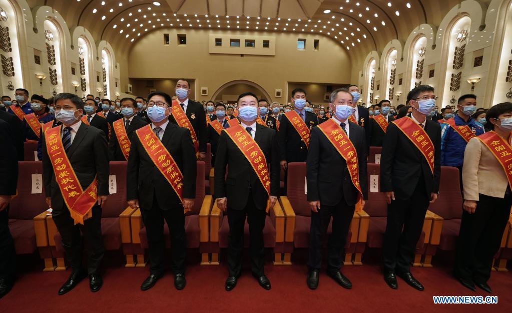Attendees rise to sing the national anthem at a mobilization meeting marking the upcoming Labor Day in Beijing, capital of China, April 27, 2021. A mobilization meeting was held in Beijing on Tuesday to mark the upcoming Labor Day. Exemplary units and workers were granted national labor awards and honorary titles at the meeting. (Xinhua/Cai Yang)
