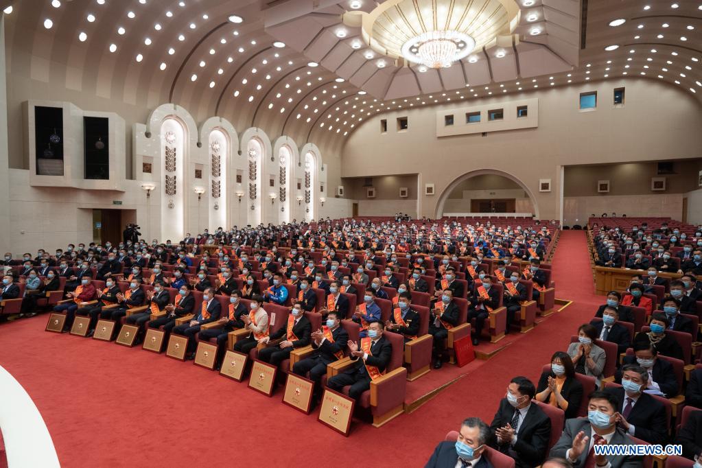 Attendees applaud at a mobilization meeting marking the upcoming Labor Day in Beijing, capital of China, April 27, 2021. A mobilization meeting was held in Beijing on Tuesday to mark the upcoming Labor Day. Exemplary units and workers were granted national labor awards and honorary titles at the meeting. (Xinhua/Cai Yang)