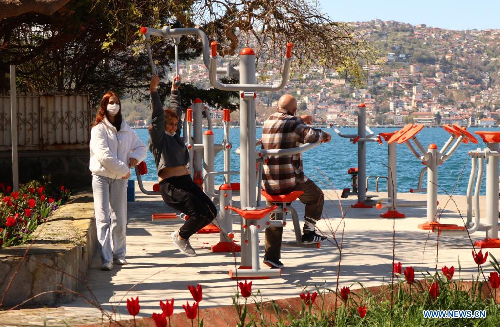 People exercise near the Bosporus Straits in Istanbul, Turkey, April 26, 2021. (Xinhua/Xu Suhui)
