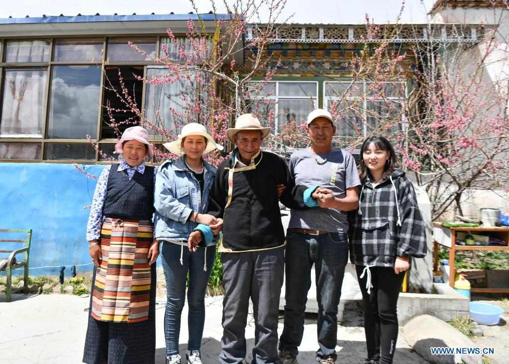 Lhapu (C) poses for a group photo with his family members in Lin'a Village of Dagze County in Lhasa, southwest China's Tibet Autonomous Region, April 25, 2021. Lhapu, born in 1938, worked as a serf before the democratic reform in Tibet in 1959, which abolished its feudal serfdom under theocracy. "As part of the production tools, we just did what the lord asked us to do, and were even forbidden to speak loudly," Lhapu recalled his life in the old times, adding that children had no guaranteed food and clothing. After the democratic reform, great changes have taken place in Lhapu"s life. He received some land and built a new house. Now the 83-year-old enjoys a happy life with his children and grandchildren. (Xinhua/Jigme Dorje)