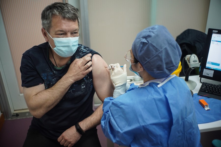 A foreign national receives a dose of COVID-19 vaccine at a vaccination site in Beijing, capital of China, April 15, 2021. (Xinhua/Peng Ziyang)