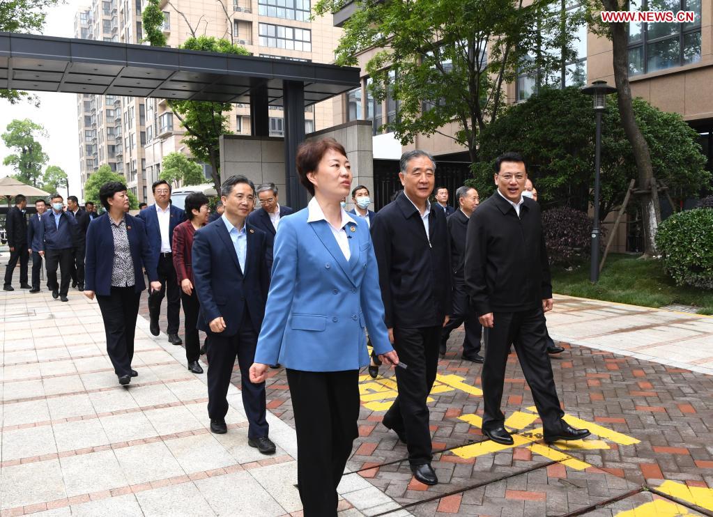 Wang Yang, a member of the Standing Committee of the Political Bureau of the Communist Party of China Central Committee and chairman of the National Committee of the Chinese People's Political Consultative Conference, visits a community in Guali Town in Xiaoshan District of Hangzhou, east China's Zhejiang Province, April 27, 2021. Wang made a research tour to east China's Shanghai and Zhejiang Province from Monday to Wednesday. (Xinhua/Rao Aimin)