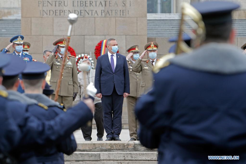 Romania's Defense Minister Nicolae Ciuca (C) attends an event to mark the Veterans Day in Bucharest, Romania, April 29, 2021. (Photo by Cristian Cristel/Xinhua)