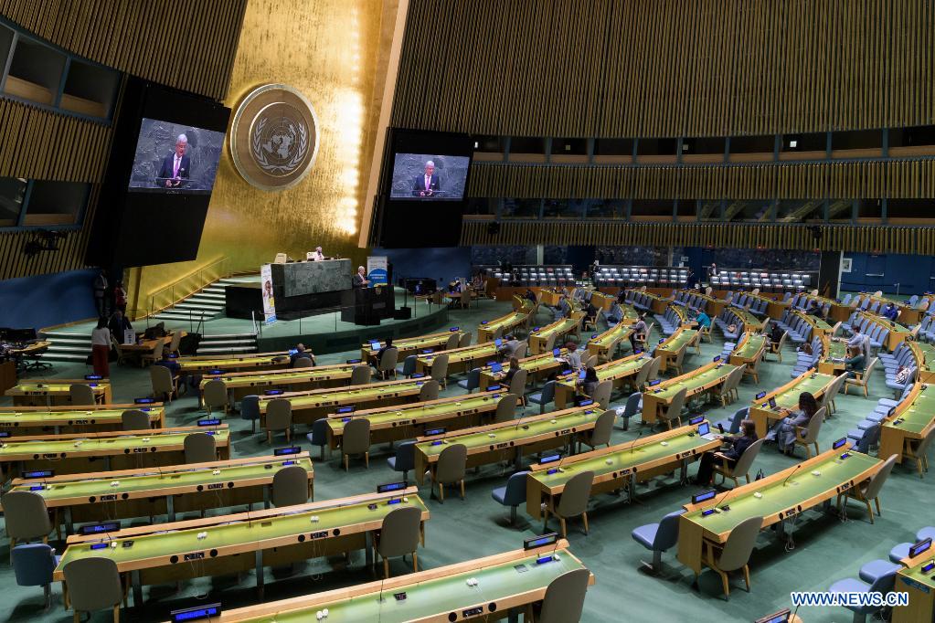 UN General Assembly President Volkan Bozkir (on screens and at podium) addresses the General Assembly high-level interactive dialogue on antimicrobial resistance at the UN headquarters in New York, on April 29, 2021. UN General Assembly President Volkan Bozkir on Thursday called on member states to take action on antimicrobial resistance (AMR). (Manuel Elias/UN Photo/Handout via Xinhua)