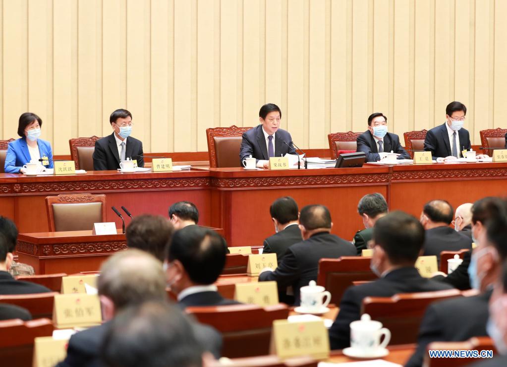 Li Zhanshu, chairman of the National People's Congress (NPC) Standing Committee, speaks while presiding over the closing meeting of the 28th session of the 13th NPC Standing Committee in Beijing, capital of China, April 29, 2021. (Xinhua/Pang Xinglei)