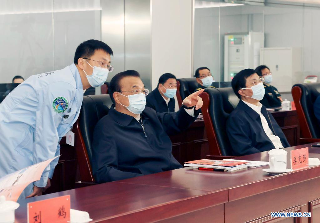 Chinese Premier Li Keqiang and member of the Secretariat of the Communist Party of China (CPC) Central Committee Wang Huning, both also members of the Standing Committee of the Political Bureau of the CPC Central Committee, watch the launch of the core module of China's space station at the Beijing Aerospace Control Center in Beijing, capital of China, April 29, 2021. China on Thursday sent into space the core module of its space station, kicking off a series of key launch missions that aim to complete the construction of the station by the end of next year. (Xinhua/Liu Weibing)