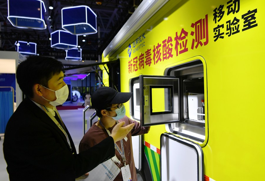 A high-tech company displays a mobile lab for COVID-19 nucleic acid testing at the digital achievements exhibition during the fourth Digital China Summit in Fuzhou, east China's Fujian Province, April 25, 2021. (Xinhua/Wei Peiquan)