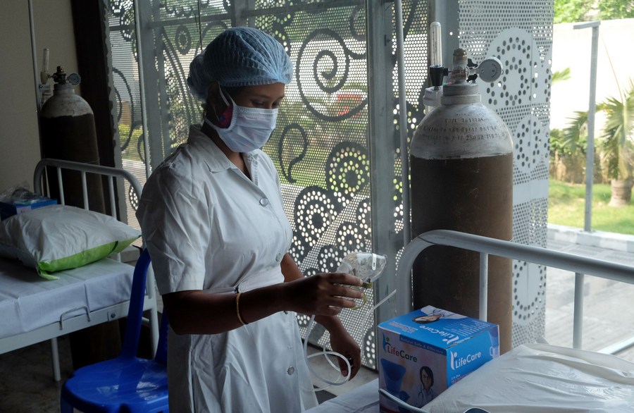 A medical worker prepares an oxygen parlor for COVID-19 patients in Kolkata, India, May 3, 2021. (Str/Xinhua)
