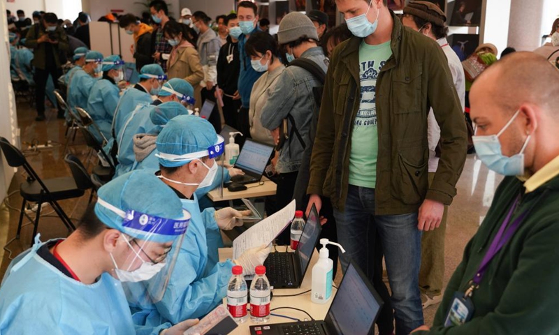 Foreign recipients get registered for Sinovac COVID-19 vaccines at a vaccination site in Tsinghua University, Beijing, capital of China, April 3, 2021. Beijing has recently started COVID-19 vaccination for foreign nationals in the city. Foreign nationals aged 18 and above may, following the principle of voluntary participation, giving informed consent and assuming personal responsibility for risk, take the COVID-19 vaccine. (Xinhua)