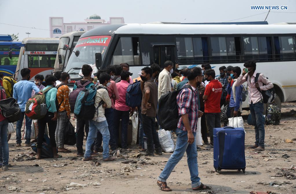 Workers wait to go back to their hometowns at a bus terminus in Patna, India, May 5, 2021. India's COVID-19 tally surpassed 21 million on Thursday as 412,262 new cases were registered across the country in the past 24 hours, said federal health ministry. (Str/Xinhua)