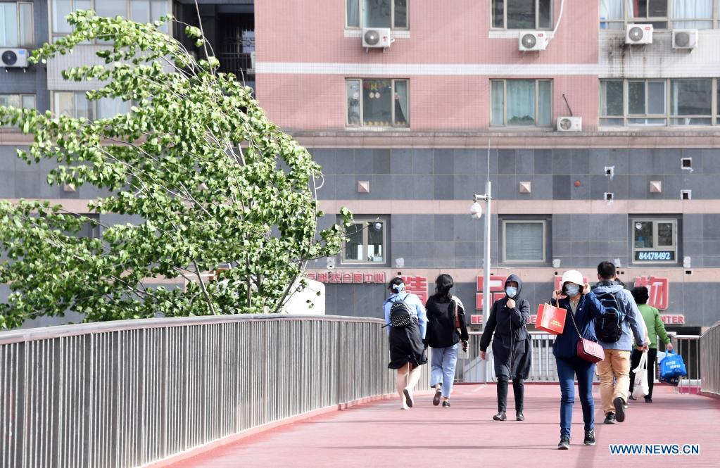 People walk on a pedestrian bridge in Beijing, capital of China, May 6, 2021. Floating sand and dust affected Beijing from Thursday noon time. (Xinhua/Ren Chao)