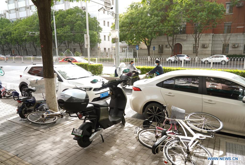 Bikes are blown over by wind in Beijing, capital of China, May 6, 2021. Floating sand and dust affected Beijing from Thursday noon time. (Xinhua/Chen Zhonghao)