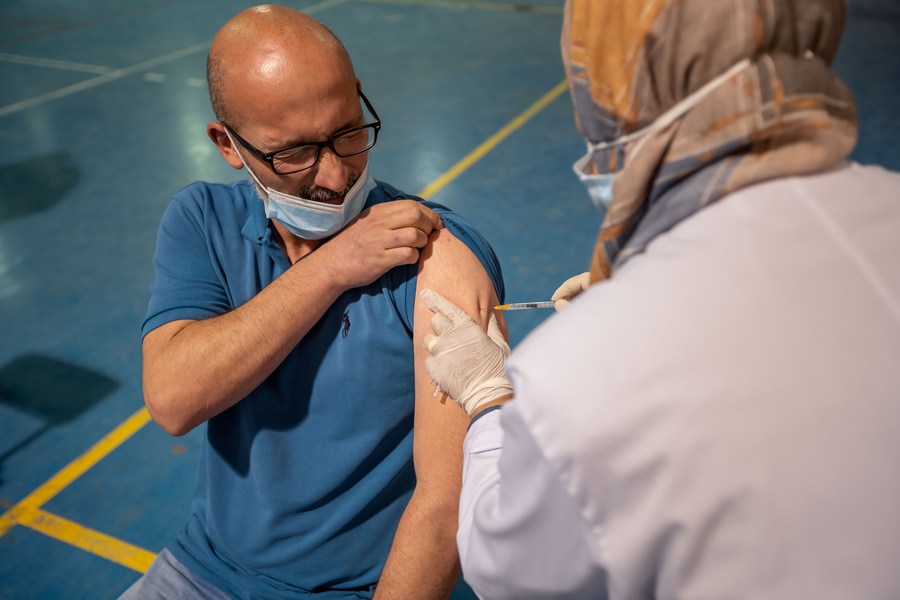 A Palestinian man receives the second dose of Chinese Sinopharm COVID-19 vaccine at a medical center during a vaccination campaign in the West Bank city of Bethlehem, April 29, 2021. (Photo by Luay Sababa/Xinhua)