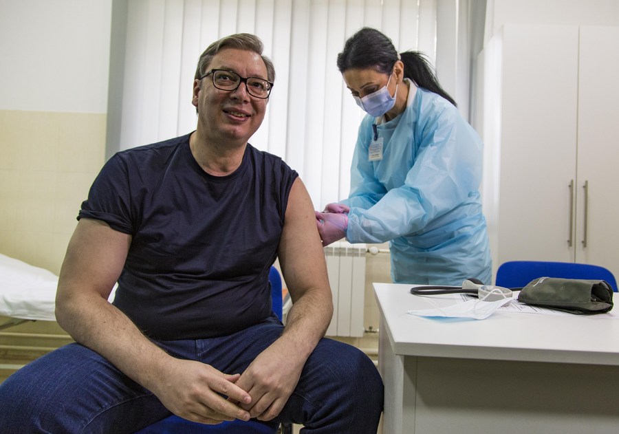 Serbian President Aleksandar Vucic receives an injection of China's Sinopharm vaccine against COVID-19 in Majdanpek, Serbia, April 6, 2021. (Xinhua/Shi Zhongyu)