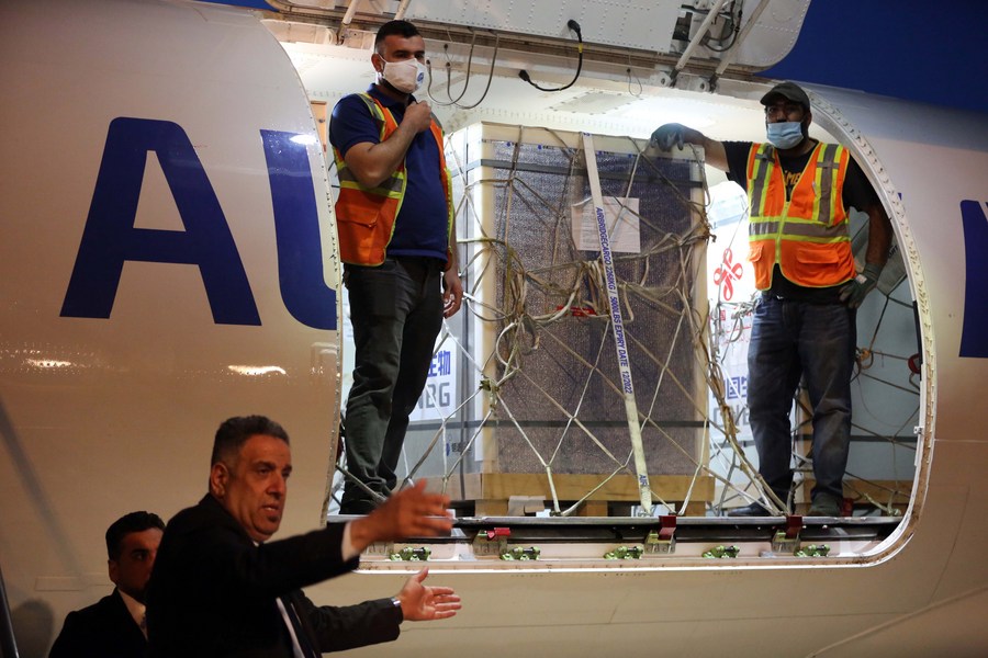 Workers prepare to unload the COVID-19 vaccines from China at the Baghdad International Airport in Baghdad, Iraq, April 11, 2021. (Photo by Khalil Dawood/Xinhua)