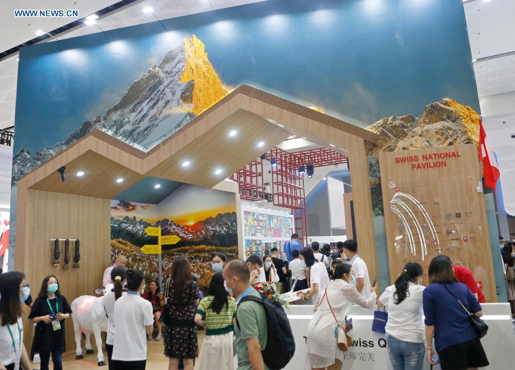 People visit the Swiss National Pavilion of the first China International Consumer Products Expo in Haikou, capital of south China's Hainan Province, May 7, 2021. Slated for May 7-10, the first China International Consumer Products Expo has attracted 648 overseas companies and 1,365 brands from 69 countries and regions, as well as 857 enterprises and 1,263 brands from China. Covering 80,000 square meters, the expo will be the largest consumer goods expo in the Asia-Pacific region, the organizers said. (Xinhua/Ding Hongfa)