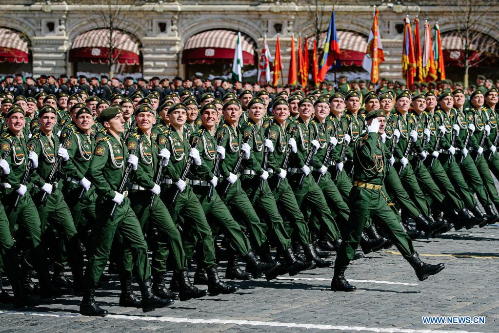 Servicemen march during a rehearsal of the Victory Day parade in Moscow, Russia, May 7, 2021. Russia will hold military parades across the country to commemorate the 76th anniversary of the Soviet victory in the Great Patriotic War on May 9. (Xinhua/Evgeny Sinitsyn)