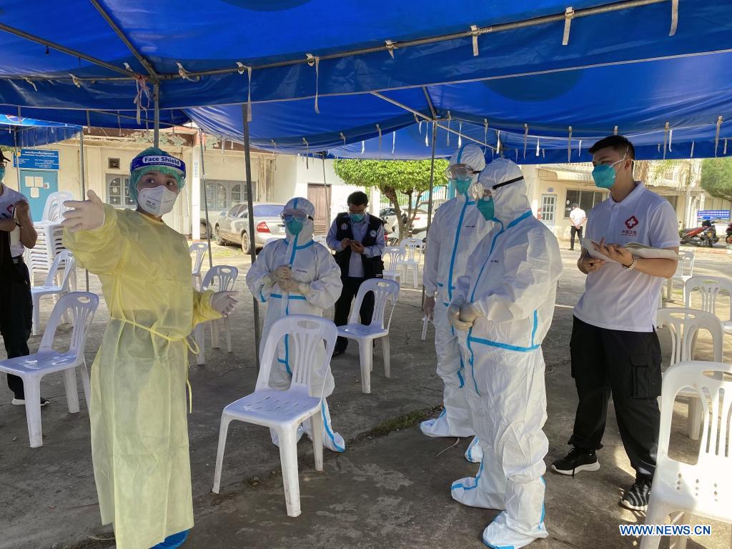 Members of a Chinese medical expert team visit a COVID-19 sampling site in Vientiane, Laos, May 7, 2021. A team of Chinese medical experts, along with medical materials, arrived in Lao capital Vientiane on Tuesday to assist Laos in fighting the COVID-19 pandemic. The medical team will help the Lao side in upgrading the precaution and treatment scheme, improving the technical level and response capabilities, studying the trend of the COVID-19 epidemic and making corresponding recommendations. (Chinese medical expert team/Handout via Xinhua)