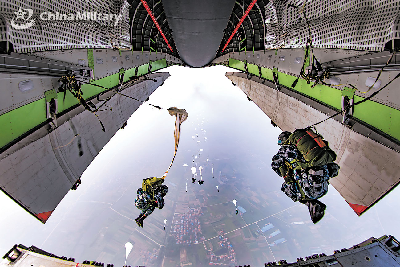 Paratroopers assigned to an airborne brigade under the PLA Air Force jump from the storehouse of a transport aircraft during a round-the-clock fully-formed force projection drill in mid-April, 2021. (eng.chinamil.com.cn/Photo by Shen Ling, Li Xuyang and Wu Yongfei)