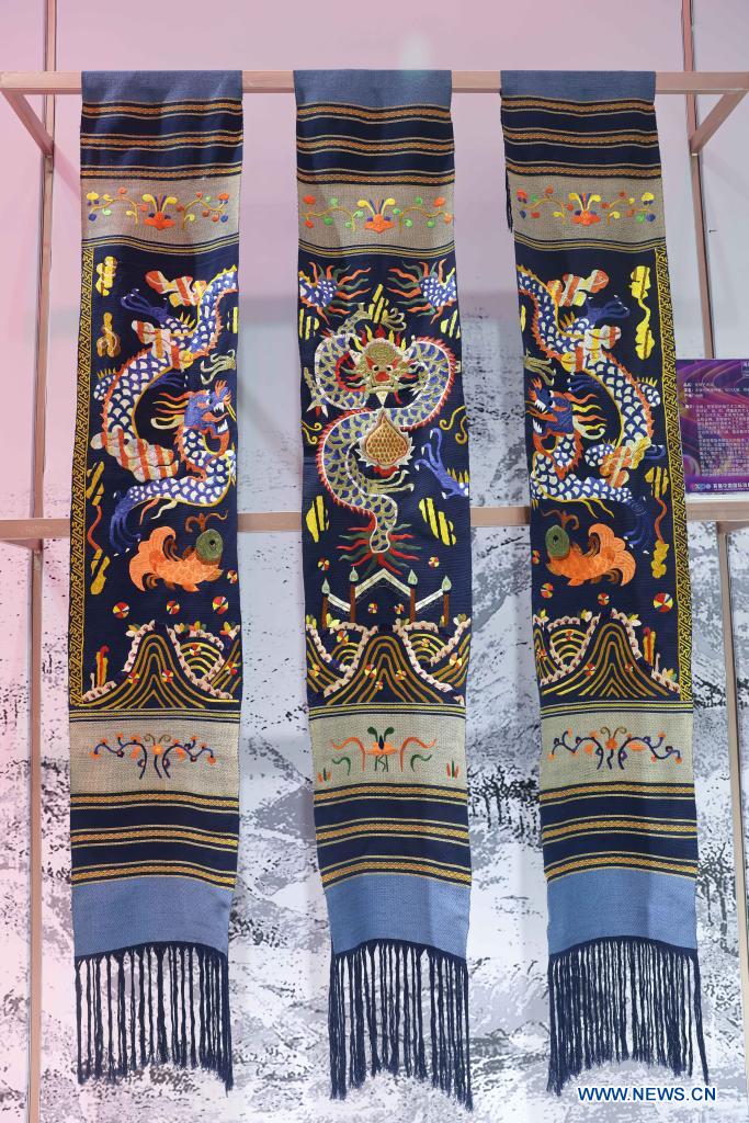 Photo taken on May 8, 2021 shows embroidery works from Li ethnic group of south China's Hainan Province on display during the first China International Consumer Products Expo in Haikou, capital of Hainan. Domestic exhibits with Chinese characteristics are quite a sight at the Expo, not only meeting the needs of consumers, but also reflecting the unique charm of Chinese culture. (Xinhua/Zhang Liyun)