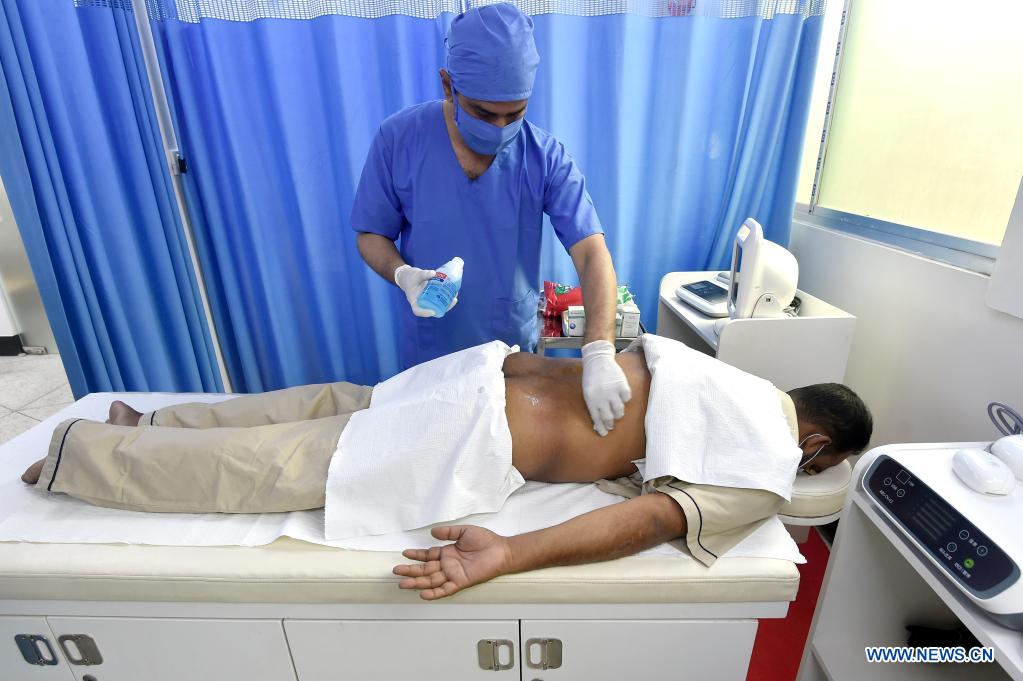 A health professional prepares to give acupuncture treatment to a recovered COVID-19 patient at a clinic in Dhaka, Bangladesh, May 1, 2021. (Photo/Xinhua)