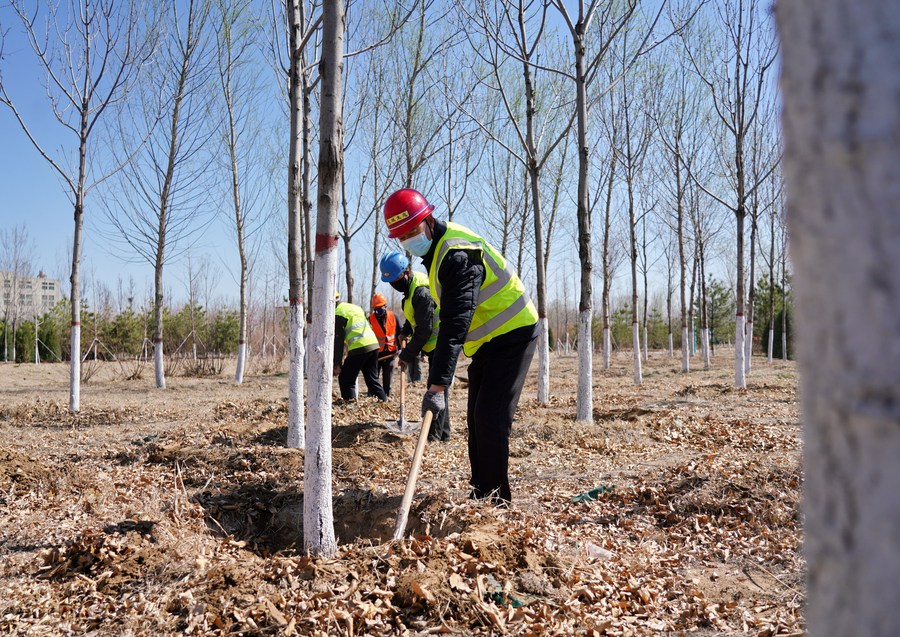 Workers take care of trees of a forestation project in Xiong'an New Area, north China's Hebei Province, March 19, 2020. (Xinhua/Yang Shiyao)