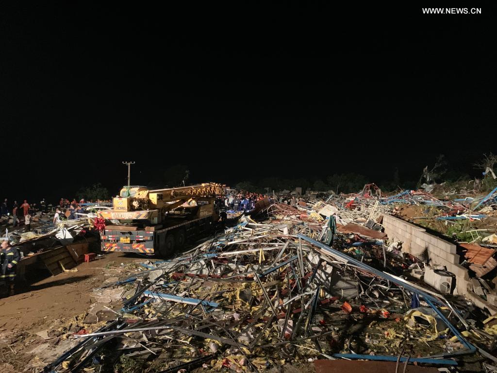 Photo taken with a mobile phone on May 15, 2021 shows the rubble of collapsed buildings after a tornado in Caidian District of Wuhan, central China's Hubei Province. Six people have been confirmed dead, and 218 others injured after a tornado on Friday night walloped Wuhan in central China's Hubei Province, government sources said. The tornado, packing winds of 23.9 meters per second, ripped through the Caidian District at 8:39 p.m. Friday, toppling some construction site sheds and snapping a large number of trees. (Xinhua/Xiong Qi)