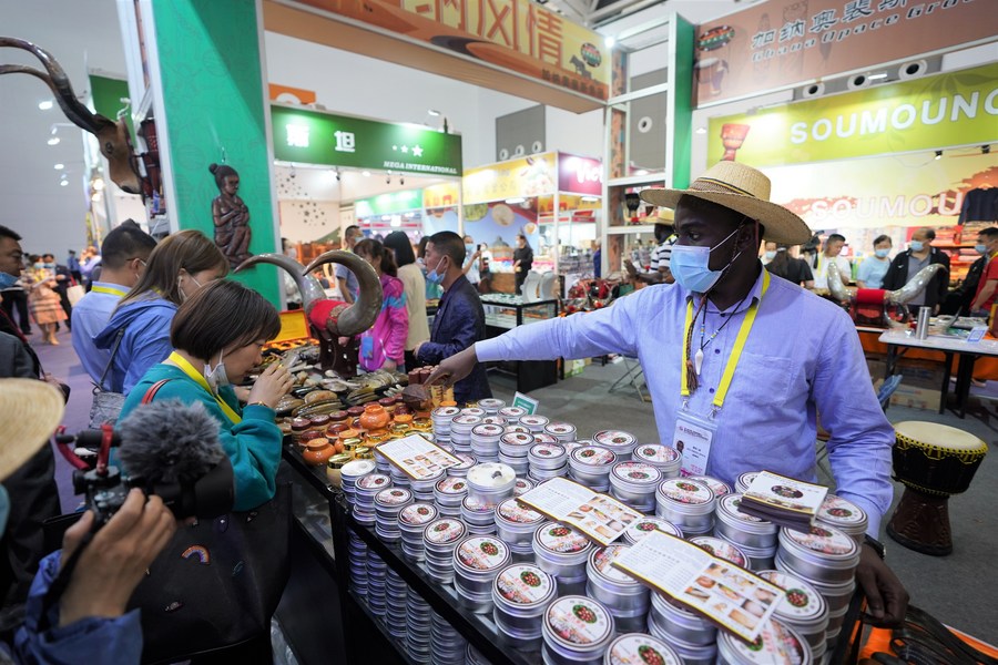 An exhibitor (1st R) introduces his products at the Fifth Silk Road International Exposition in Xi'an, capital of northwest China's Shaanxi Province, May 11, 2021. (Xinhua/Zhang Bowen)