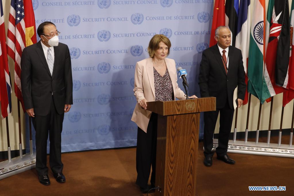 Norwegian Permanent Representative to the United Nations Mona Juul (C) speaks to reporters with Zhang Jun (L), China's permanent representative to the UN, and Tarek Ladeb (R), Tunisia's permanent representative to the UN, after a Security Council open debate on the Israeli-Palestinian conflict at the UN headquarters in New York, May 16, 2021. (Xinhua/Xie E)