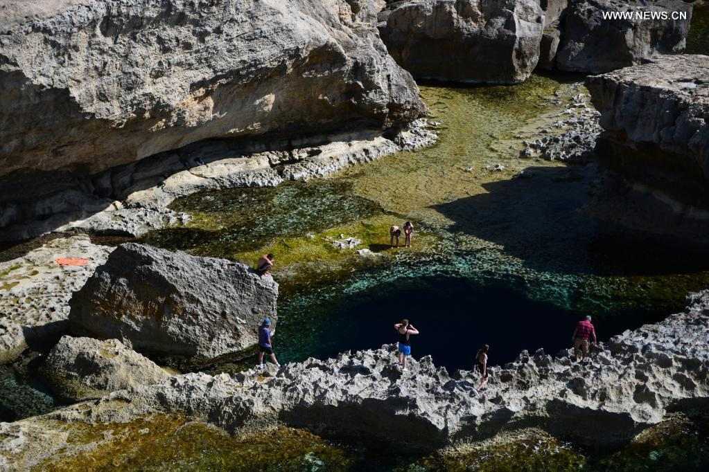 People enjoy themselves at Dwejra Bay in Gozo, Malta, May 17, 2021. The Dwejra Bay is where the natural Azure Window once stood. The natural arch collapsed in 2017. (Photo by Jonathan Borg/Xinhua)