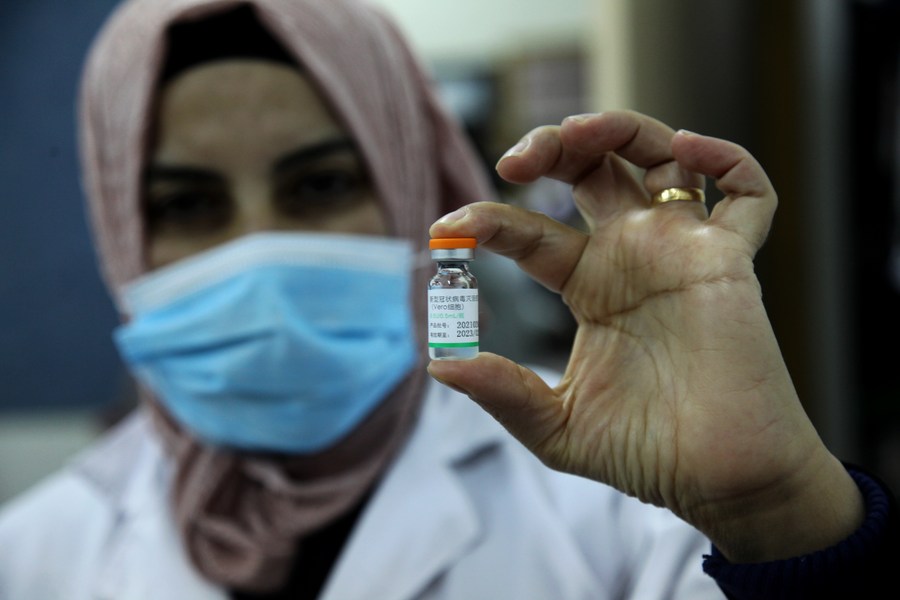 A health worker displays a dose of Sinopharm COVID-19 vaccine during a vaccination campaign in the West Bank city of Ramallah, on April 1, 2021. (Photo by Nidal Eshtayeh/Xinhua)