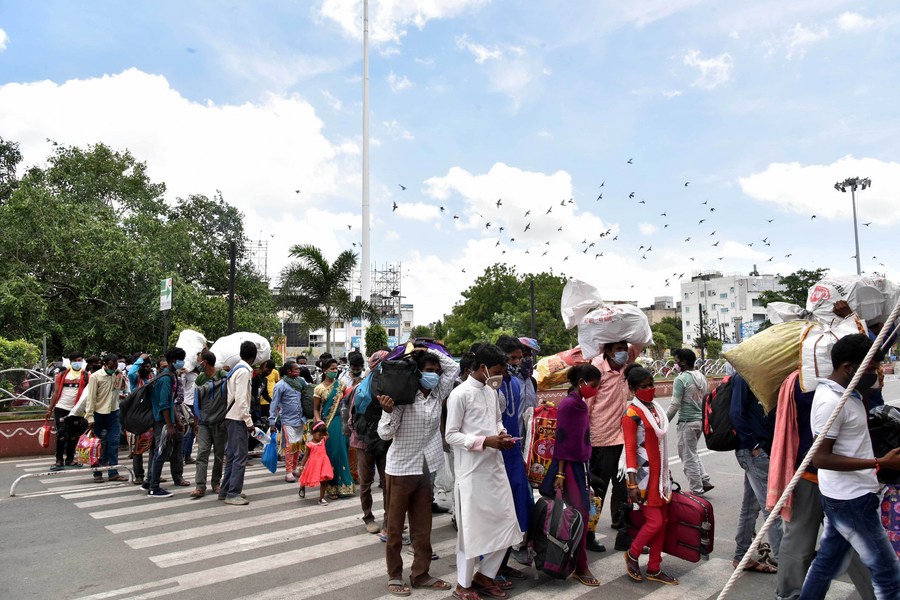 Migrant workers line up to enter Secunderabad railway station near Hyderabad, India, on May 15, 2021, during a lockdown to curb the surge of COVID-19 pandemic. (Str/Xinhua)