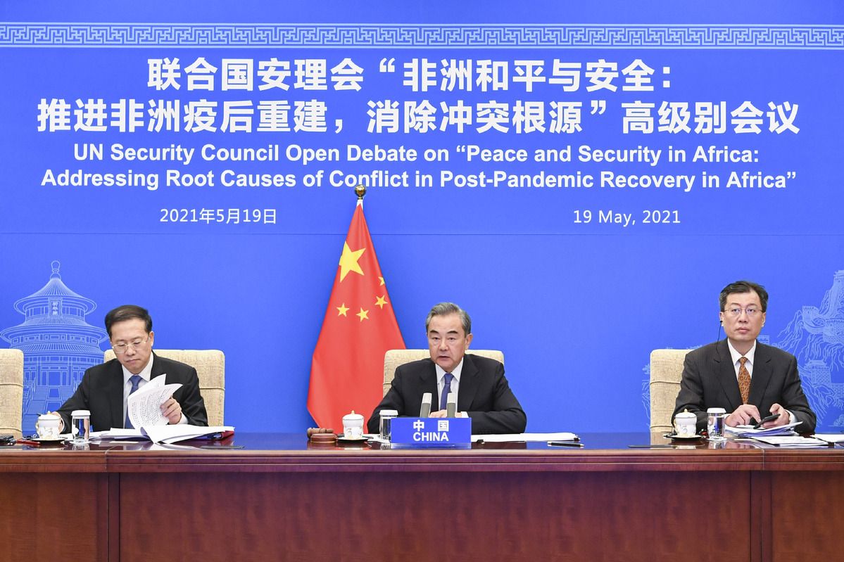 Chinese State Councilor and Foreign Minister Wang Yi chairs the United Nations Security Council (UNSC) open debate on "Peace and Security in Africa: Addressing Root Causes of Conflict in Post-Pandemic Recovery in Africa" via video link on May 19, 2021. [Photo/Xinhua]
