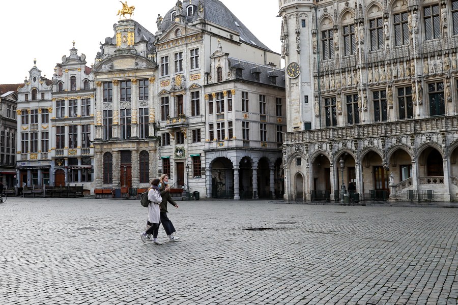 People walk on the Grand Place in Brussels, Belgium, Jan. 22, 2021. (Xinhua/Zhang Cheng)