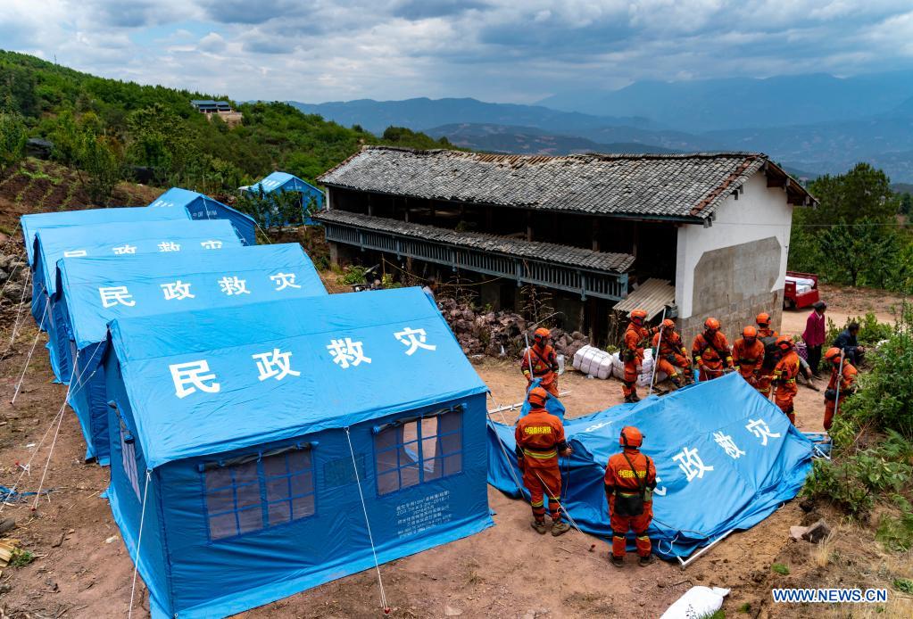 Rescuers build shelters in Xiuling Village of Yangbi Yi Autonomous County, southwest China's Yunnan Province, May 22, 2021. Four earthquakes over 5.0-magnitude struck Yangbi Yi Autonomous County in Dali Bai Autonomous Prefecture of Yunnan from 9 p.m. to 11 p.m. Friday Beijing Time. The tremors were felt in all 12 counties and cities of the prefecture, with Yangbi being the worst hit. So far, over 16,200 rescuers and relief materials including tents and daily necessities have been dispatched to the quake area. Over 22 million yuan (about 3.4 million U.S. dollars) has been allocated for emergency relief. Yangbi has arranged 380 centralized settlement sites for over 85,000 affected people. (Xinhua/Chen Xinbo)